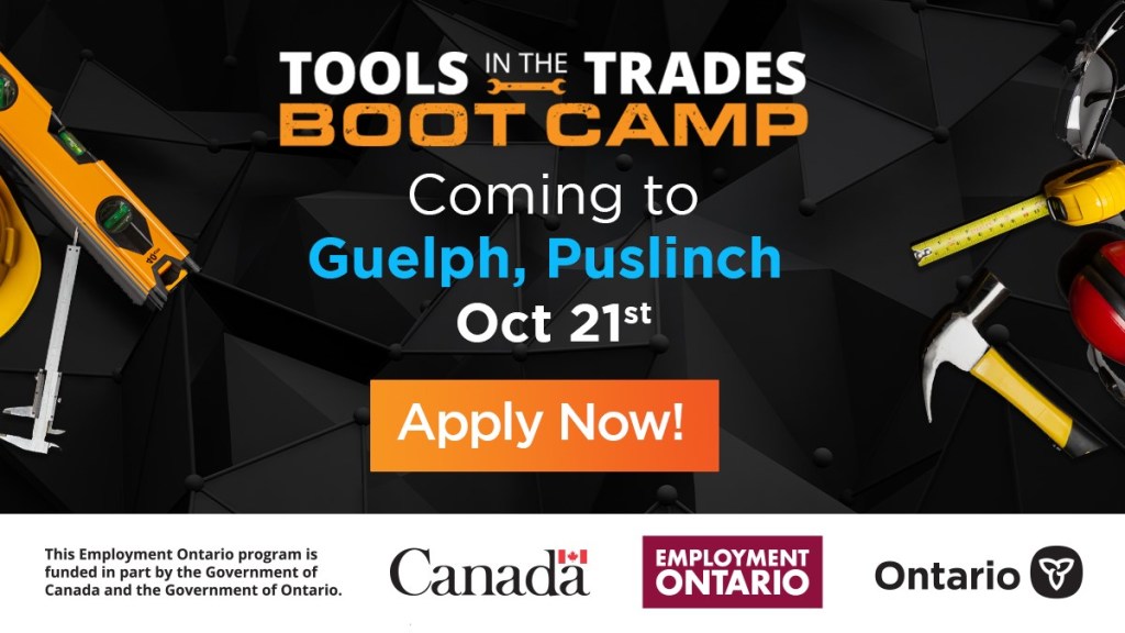The Tools in the Trades Boot Camp is coming to Guelph on October 21st. This event is for adults not currently enrolled in full-time education and who are interested in the trades, and it’s FREE! Apply today! Spots are limited.