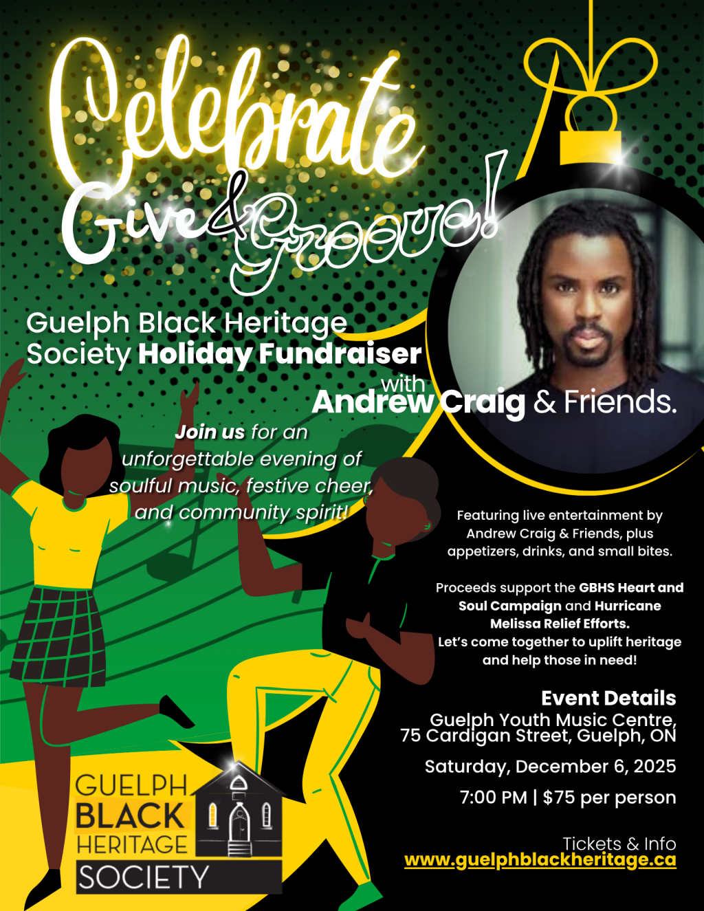 Join the Guelph Black Heritage Society (GBHS) for its annual Holiday Fundraiser—a night of soulful music, festive cheer, and giving back. Enjoy live entertainment by the acclaimed Andrew Craig & Friends, plus delicious appetizers, drinks, and small bites.